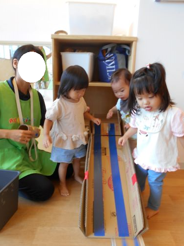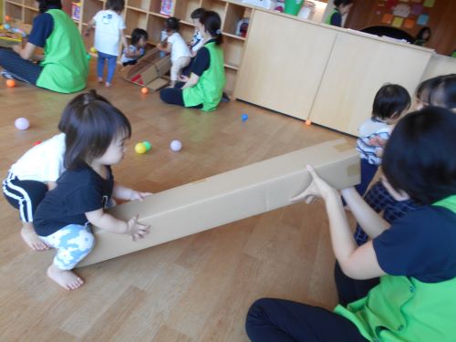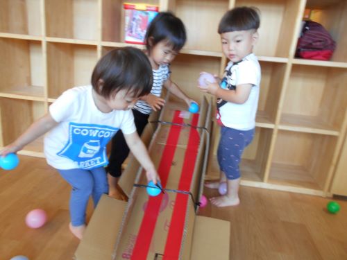 すべり台の形にした段ボールが登場すると、子どもたちも興味持ってボールを上から滑らせて遊んでいました