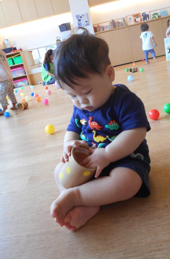 大きな長い筒の中を覗いたり、中にボールを入れて転がしたりして、みんな夢中で遊んでいました❣