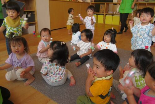 皆でマラカスを持って「おもちゃのチャチャチャ」や「手をたたきましょう」の音楽に合わせて、合奏しました♫