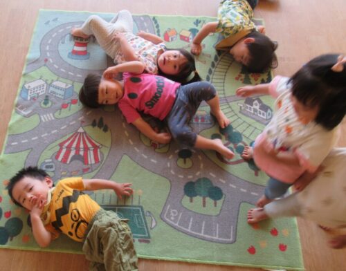 体操の後に、ゴローンと横になって休憩しているお友だち😄🎵