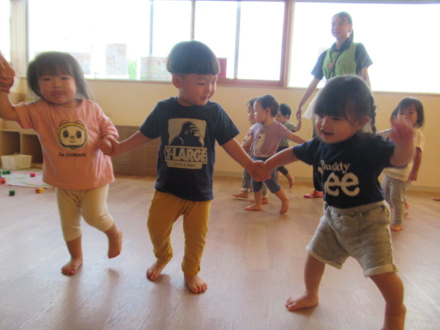 「♬さんぽ」の音楽が流れると、みんなお友だちと手をつないで音楽に合わせて歩き出します🎵自分から手を差し伸べて、仲良くギュッと手をつないでいました✨