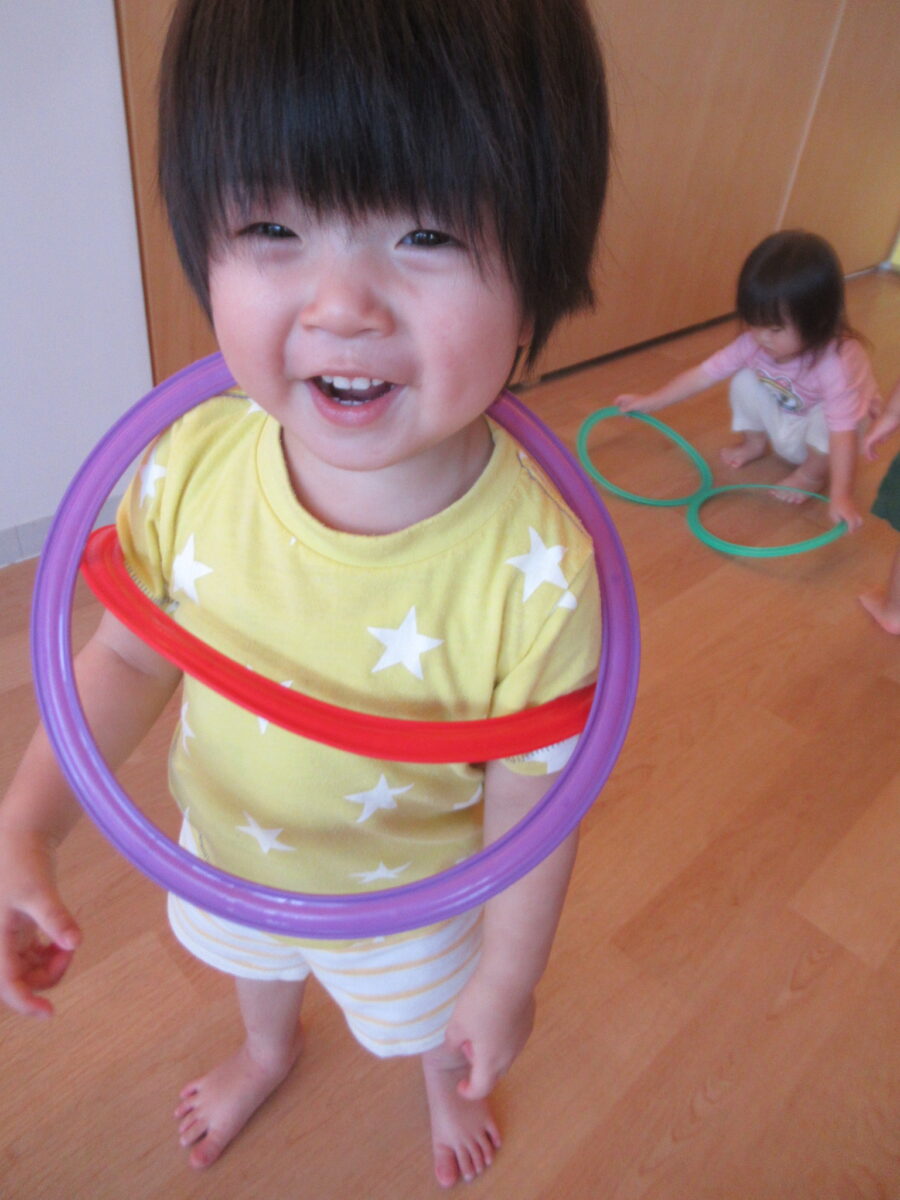 輪っかで自由に遊ぶ時間では、輪っかを身体に通したり、床に重ならないように並べたりして、自分の好きな遊び方で楽しんでいました😄💕