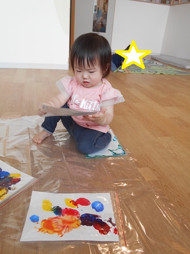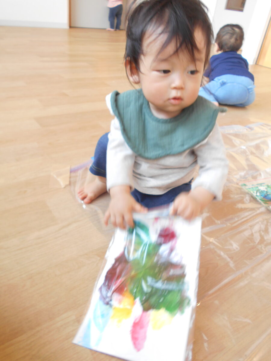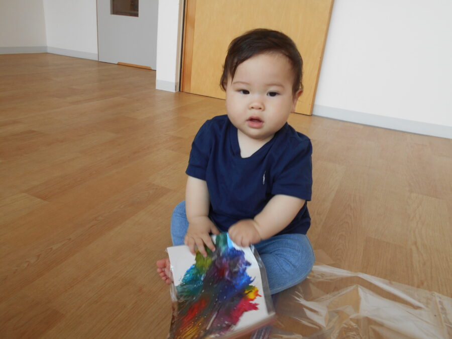 製作遊びをしました✨ジップロックに入れた画用紙に、ハイハイすることで絵の具を広げていきますよ~!