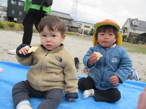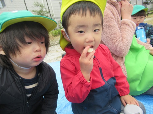 ブルーシートに皆で座って嬉しそうに食べている様子があり、「おいしいね!」と話していましたよ✨