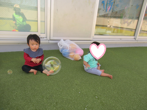 しゃぼん玉だ❣ 触れるかなあ?? と言わんばかりに