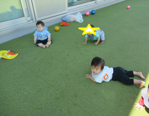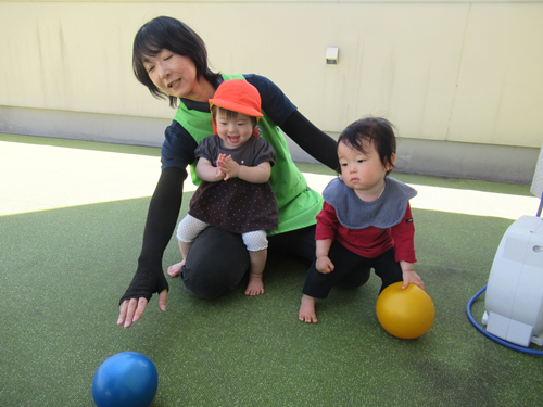 ボールがコロコロと来て手を叩いて喜んでいるお友だちです。