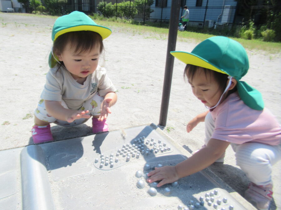 鉄棒にぶらーんとして遊んでいたと思ったら、今度は足元の足ツボに興味津々でした(笑)ゴツゴツしている感触が面白いようです😀✨