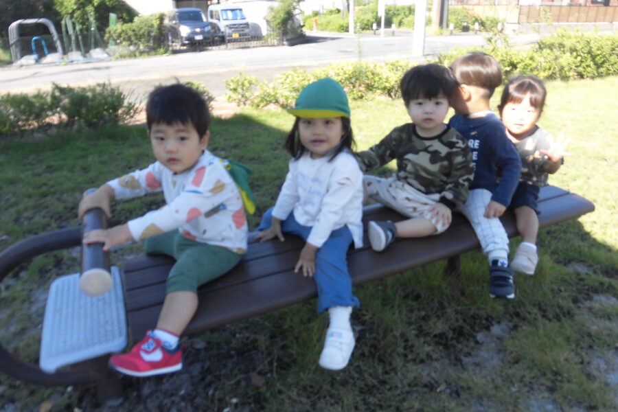 公園に着いてベンチに座って先生と手遊びやお歌をうたって遊んでいたり🎵