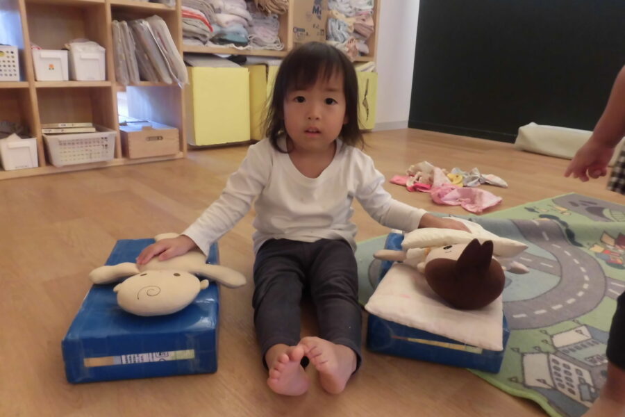 ままごとコーナーでは赤ちゃんをベッドに寝かせて、優しくトントンしているママがいましたよ🎵☺