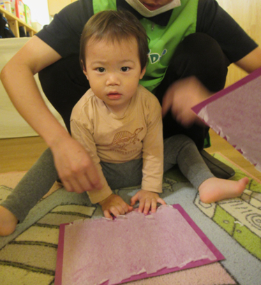 花紙を指でつまみビリビリと破いていくのですが、要領をつかむと自分で取り組んでいくことができていました✨