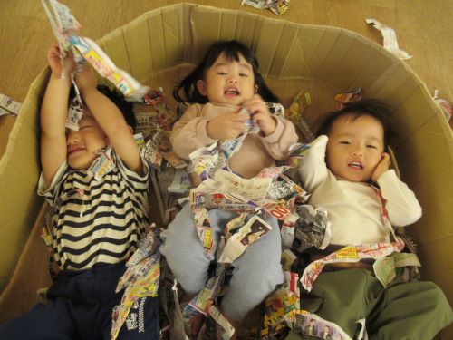 新聞紙遊びに興味を持ってきてくれたお友だち‼先生が「ビリビリ~!」と言って破るのを見て、みんなも挑戦!!