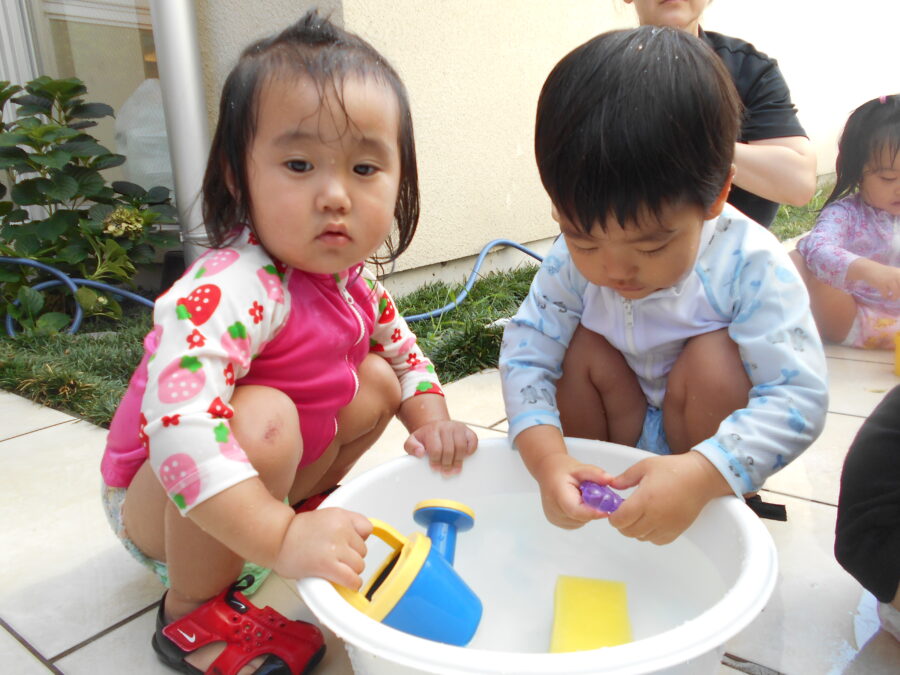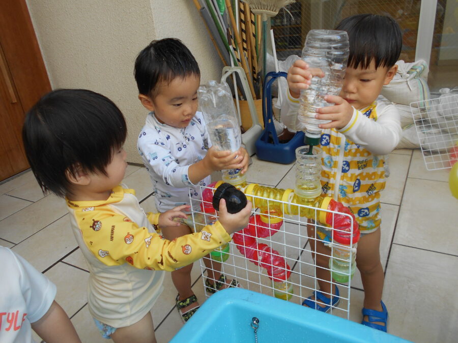 みんなそれぞれ気になるおもちゃを手に取り、早速水をすくってみたり、水を入れたりして楽しんでいました💗