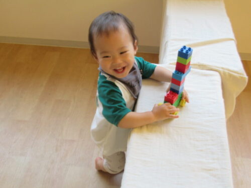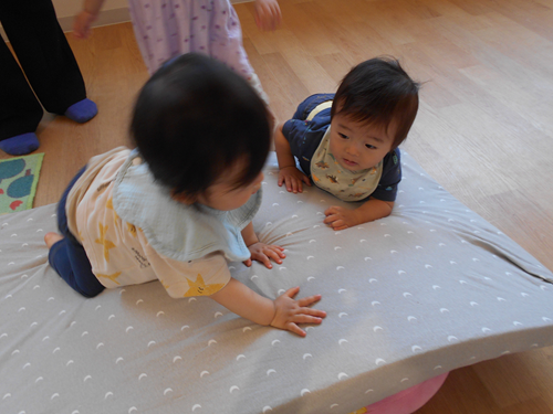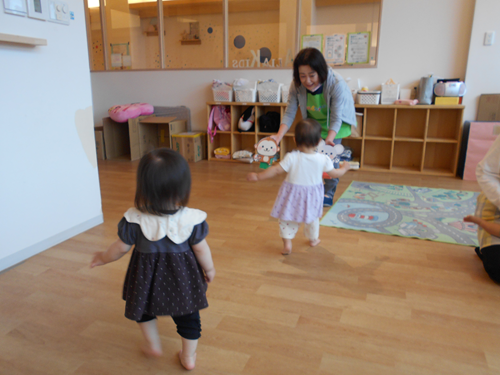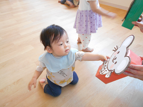 お部屋の端に動物を用意して「おいで~!」と呼ぶと はいはいや歩行で