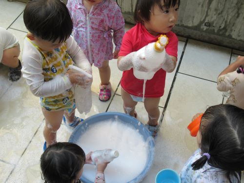 コンクリートの壁に泡をくっつけてみたり、おもちゃを泡の中に隠してみたりして、みんな泡遊びに夢中です💕