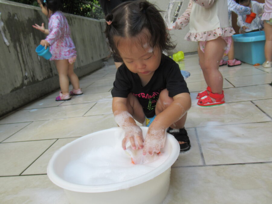 泡遊びでは、シャワーで泡がもこもこと出てくる様子に、みんな興味津々✨