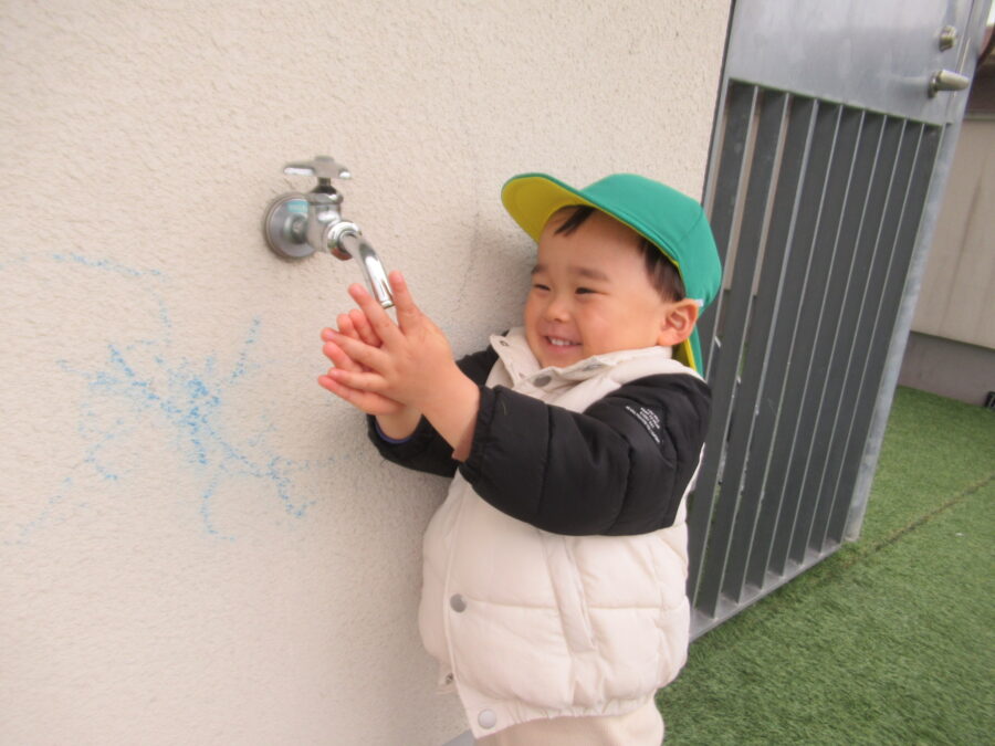 園庭に設置されている蛇口で、手を洗っているまねをしているお友だちを発見✨