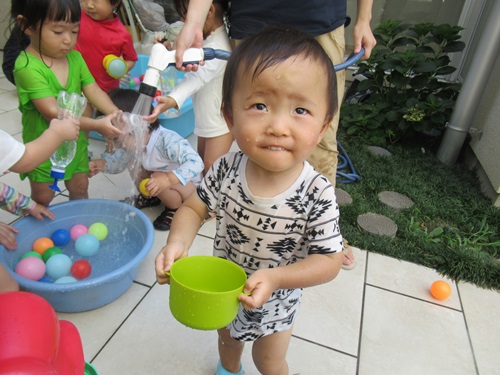 昨日に続きカラーボールをお水に浮かせて、水あそびを楽しみました😄♫