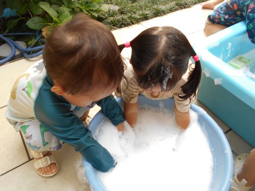 途中泡を作って興味ある子はタライの周りに遊び集まってきて泡の感触を楽しみました