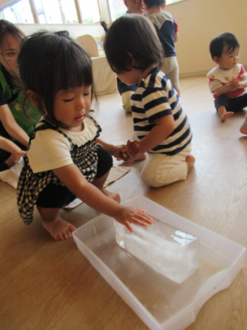 今日の氷あそびでは、氷の中に紫陽花やミントなど草花が入っていて興味津々な子どもたち😄💗