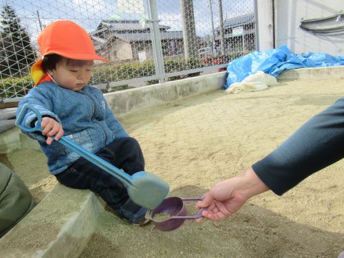 ひよこさんも自分で好きな玩具を選んで、砂をすくって、、。先生がカップを差し出すと、その中に砂を入れてくれましたよ😊