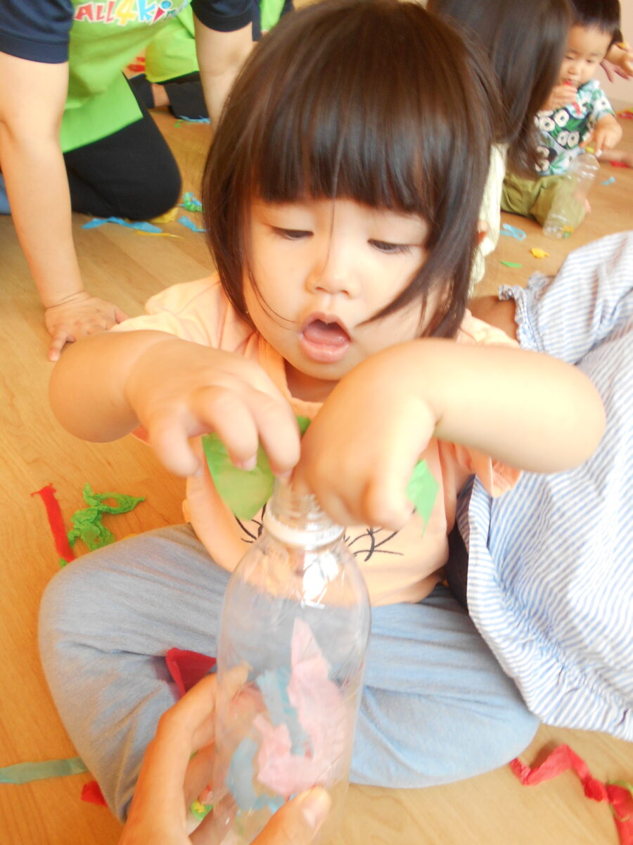 ペットボトルの中に破いた花紙を入れてみるよ!