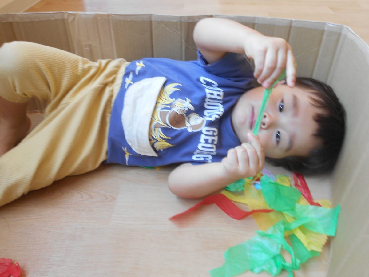 びりびり破いた花紙を段ボールのプールに入れると、中に入って花紙を手に取り、じっくりと感触を味わっていました😊