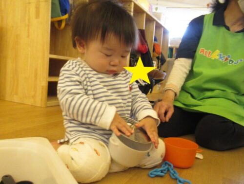 お鍋にふたができることを発見したお友だちは、ふたをしめてみたり、お鍋の中におもちゃをいれてみたりしながらクッキングしていました✨