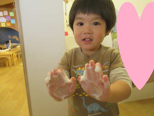 給食のまえに、いただいたおはなの形で石鹸がでてくる