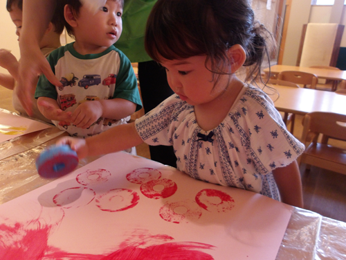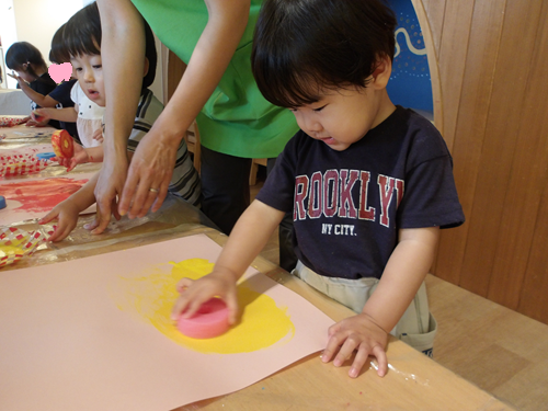 プールスティックを切ったものをつかってえのぐスタンプをやってみました!