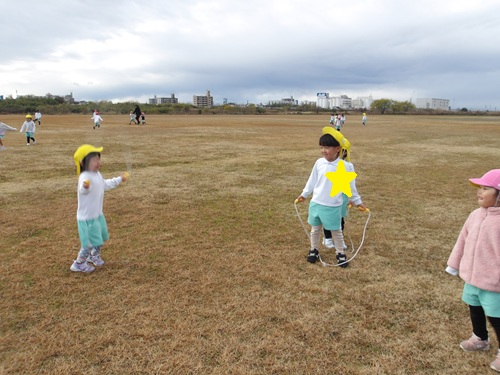 野球をしている様子を見ながら散歩をしたり、グラウンドでは縄跳びや身体を動かして楽しみました😆🎶