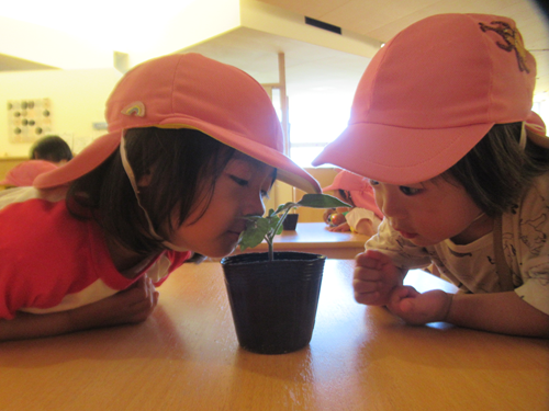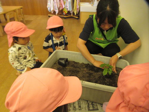 あひる組のみんなで育てた、アサガオに興味津々です💕