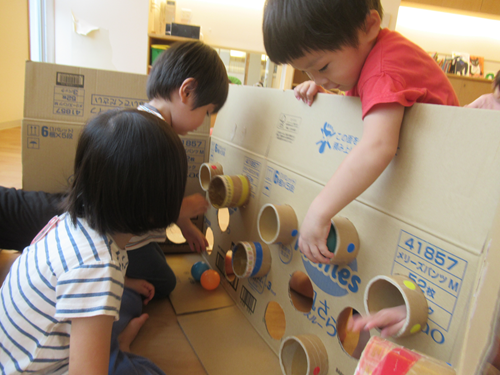 段ボールに穴を空けておくと、筒をいれてボールを転がしていました!