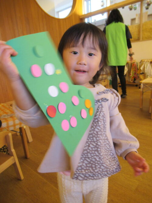 エントランスにクリスマスツリーやお友だちが作ったクリスマスソックスの飾り付けが始まり、「クリスマス」をより一層楽しみにしているあひる組さん😍