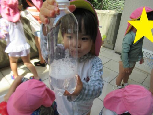 こちらのお友だちは、泡の混ざったお水をペットボトルに入れると、