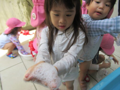 泡を手のひらに乗せて、フーッと飛ばしてみるお友だちや、