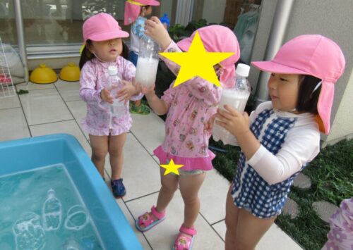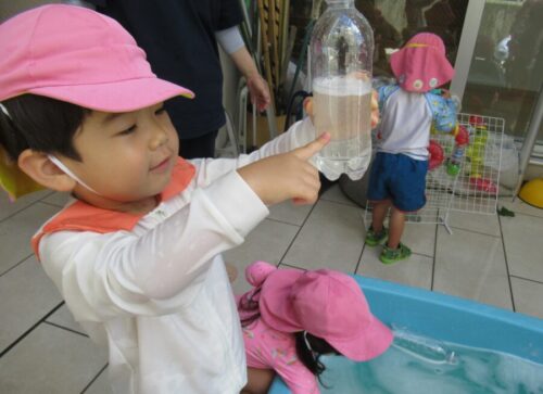 フタを閉めてペットボトルを振ると泡が増えることに気付いたあひる組さん。