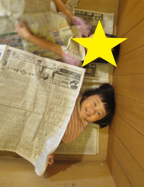 ひとりずつ、新聞紙のおうちに入って座ったり、立ったりしたり、「角ってどこだろう?」と考えてみたりして新聞紙とふれあいました😊