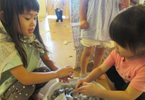 小さくなった新聞紙はタライに集めてお水をいれて感触遊びをしました🌟