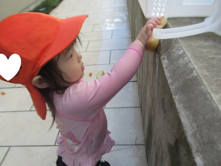 コップに水を汲み、ちょろちょろと水を掛けて色の変化を楽しむお友だちも❣