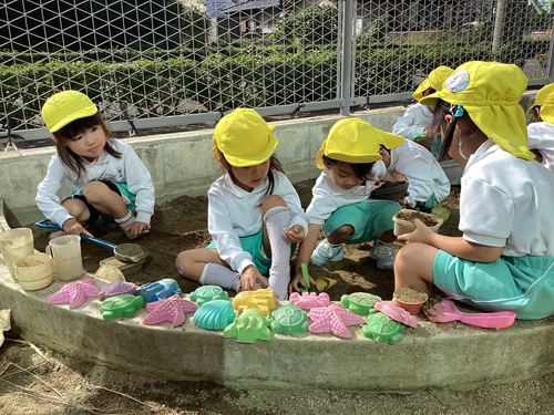 たくさん型を並べて「どれがいい?」とお友だち同士で選び合いっこをしたり、みんなで山を作って貝殻の型でデコレーションをしたりして楽しんでいます♪