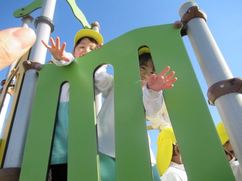 こちらのお友だちは「先生、ハロー!!」と遊具の上から手を伸ばしてニコニコ笑顔です😆
