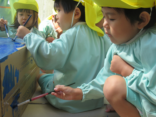 うさぎ組さんは中庭で段ボールに絵の具を塗りました![]()