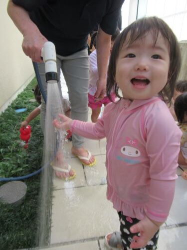 ひよこ組の子も一緒に遊んでいる中、ホースから出る水が気になって触りに行ったり、