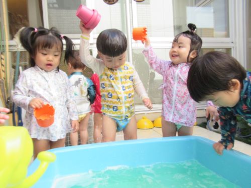 他のタライに作った色水を自分たちで運び大きなプール(透明の水)にじゃぼんっとたくさん入れ、色が変化していくのを皆でかき混ぜて楽しんでいました![]()