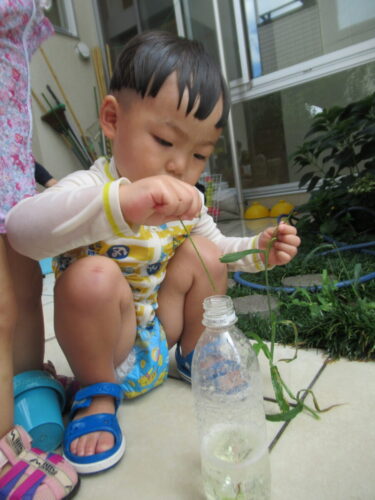 保育者が葉っぱをちぎって水に浮かせてみると、自分でちぎってきてペットボトルに入れて遊ぶ子や身体にくっつけて遊ぶという子どもたちで遊びを広げ楽しんでいる姿が見られました![]()