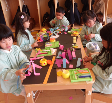 お部屋チームは、細長い紙をクルクルしたり折ったりして、色や形が違う模様を「ペタペタ」