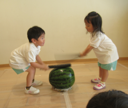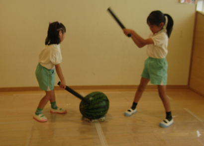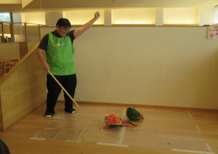 なかなか割れないスイカに悪戦苦闘しながらチャレンジしていましたよ