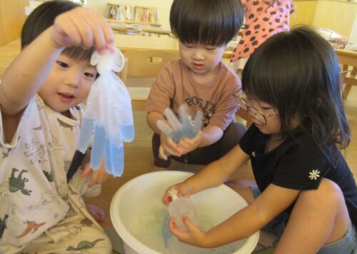 今日の水遊びではゴム手袋の中に水と色水氷を入れて水の性質にふれながら感触遊びをしました😊