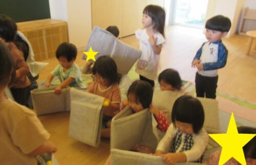 あひる組になってからは初めての防災頭巾にモジモジしているお友だちもいましたが、先生が手伝ってみると被れたことを喜んでにっこりしていましたよ😆