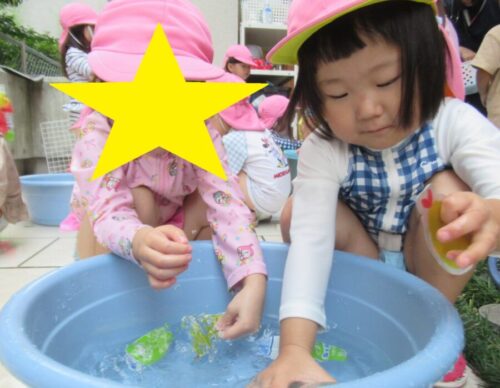 今日は水遊びの前に「防災頭巾」を被ってみました。